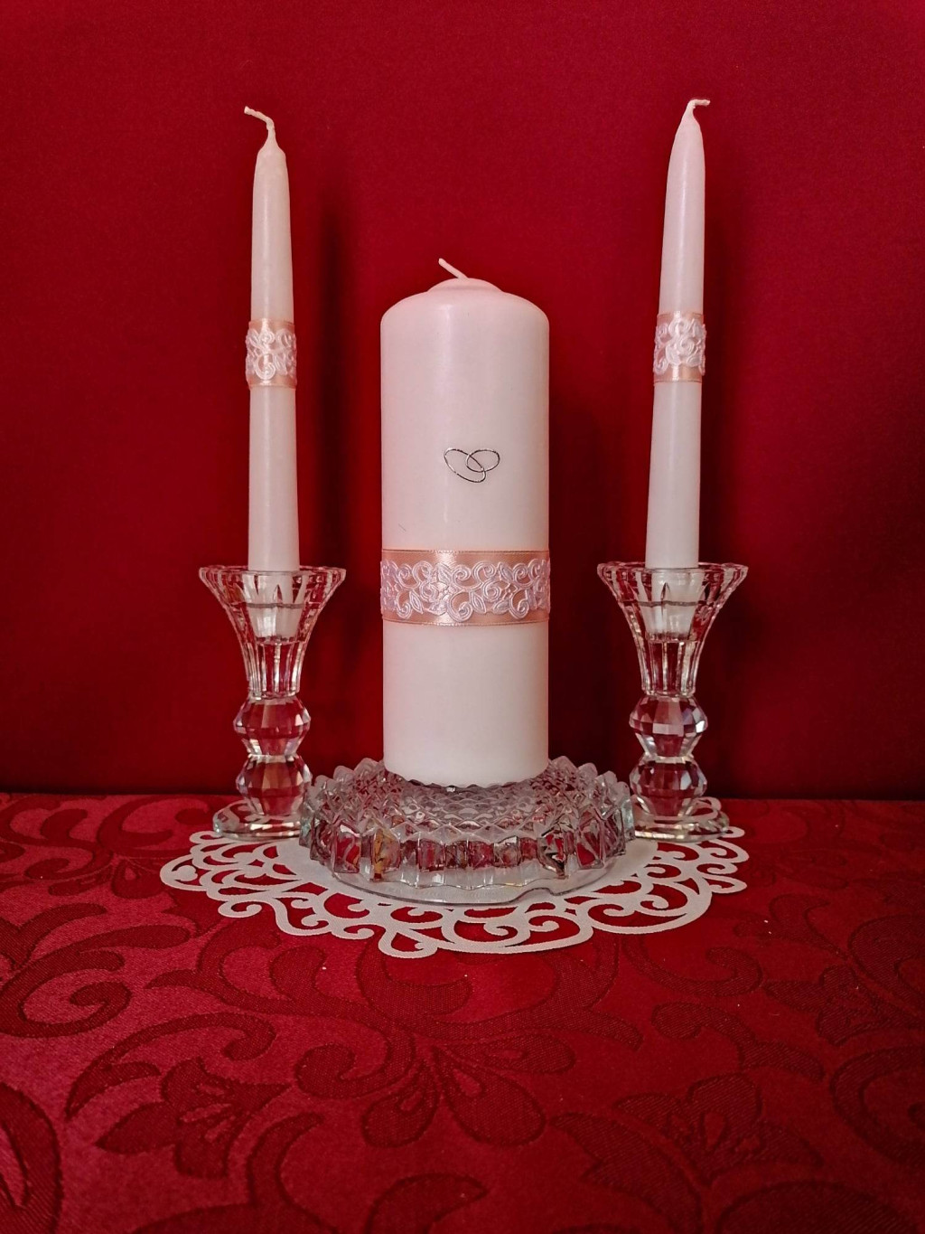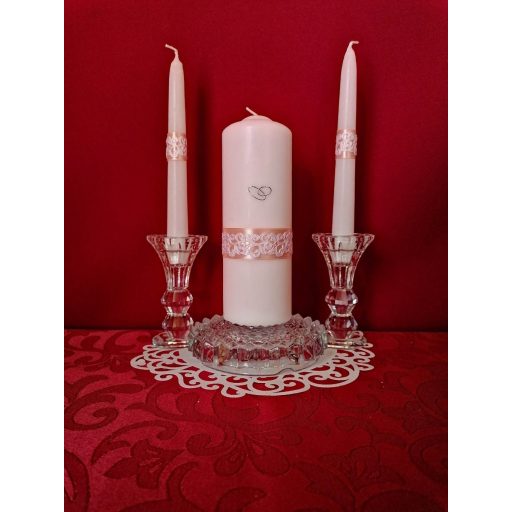 3 részes esküvői gyertyaszett csipke dísszel, barack