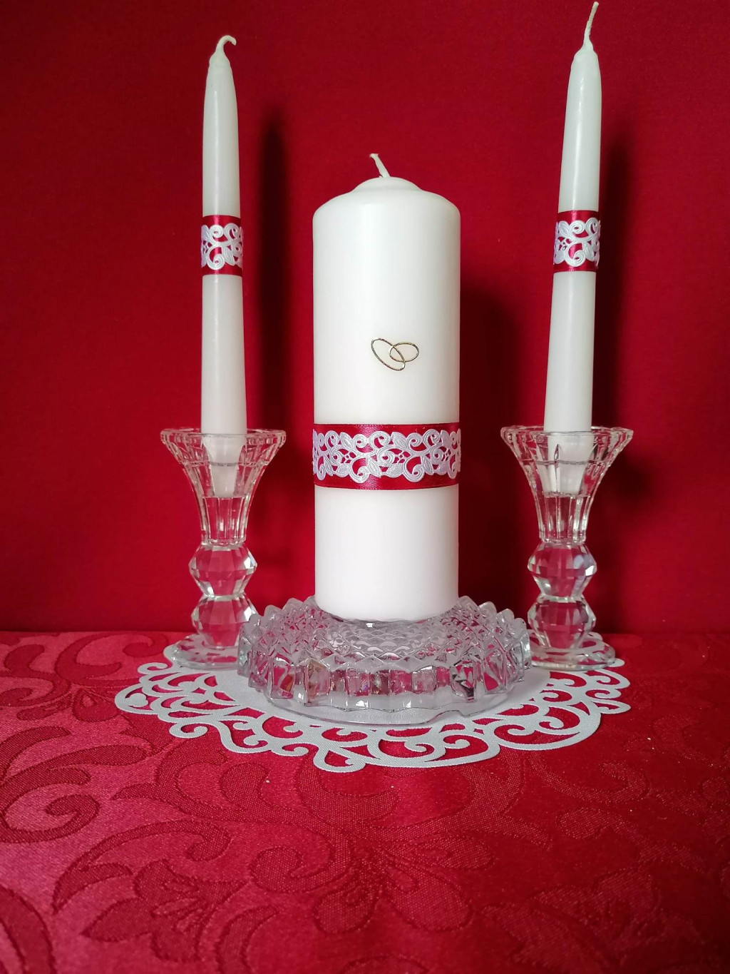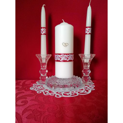 3 részes esküvői gyertyaszett csipke dísszel. bordó