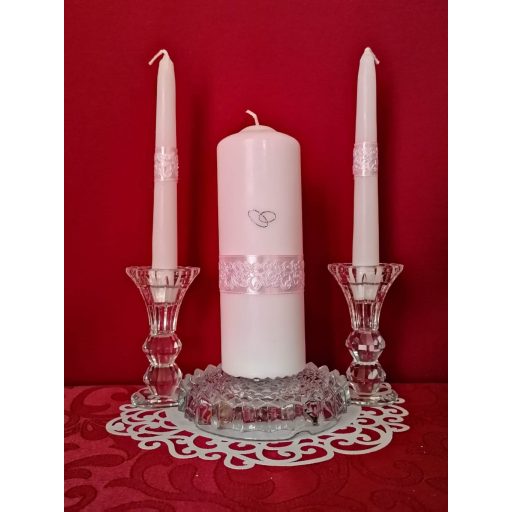 3 részes esküvői gyertyaszett csipke dísszel, rózsaszín