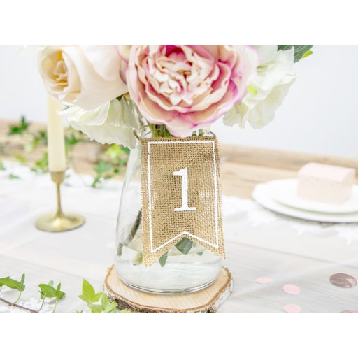 Jutából készült asztalszámok fehér nyomtatással, a készlet 1-től 20-ig terjedő számokat tartalmaz