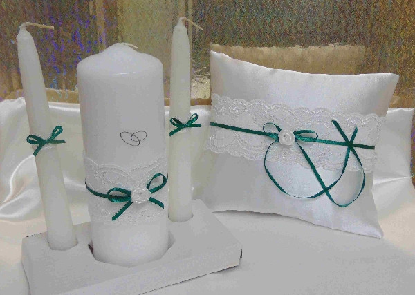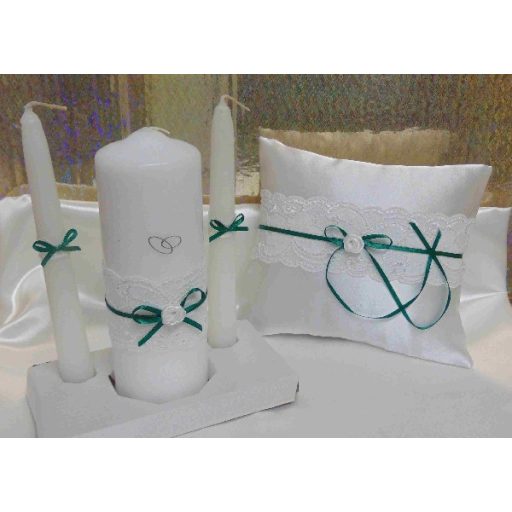 Esküvői gyertyaszett 3 részes, smaragdzöld szalaggal