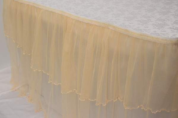 A tüllből készült dísz gombostűvel rögzíthető az asztalszoknyához.