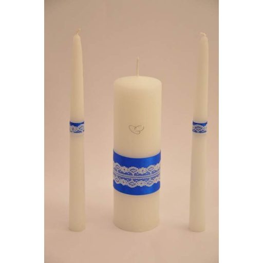 Kék alapon csipkés esküvői gyertyaszett (3 részes)