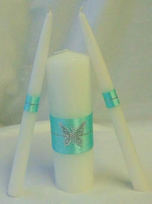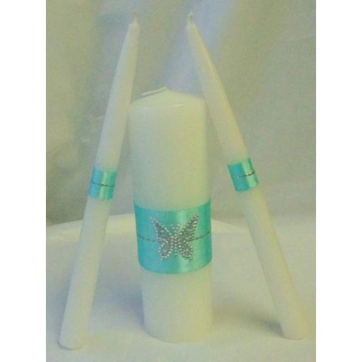 3 részes esküvői gyertyaszett strassz pillangóval, menta